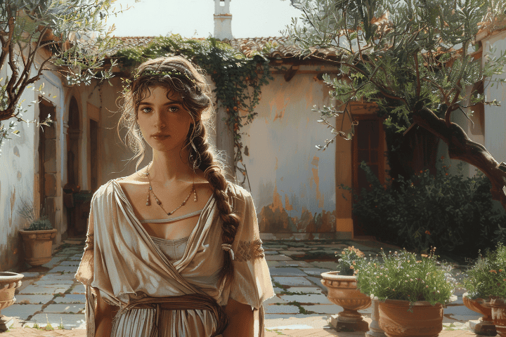 索菲亚(Sophia是希腊名,意为智慧)坐在中庭柱廊下的一张木桌前,她正在伏案抄书。旁边,她的母亲克莱奥与其侍女沙拉正在织布。